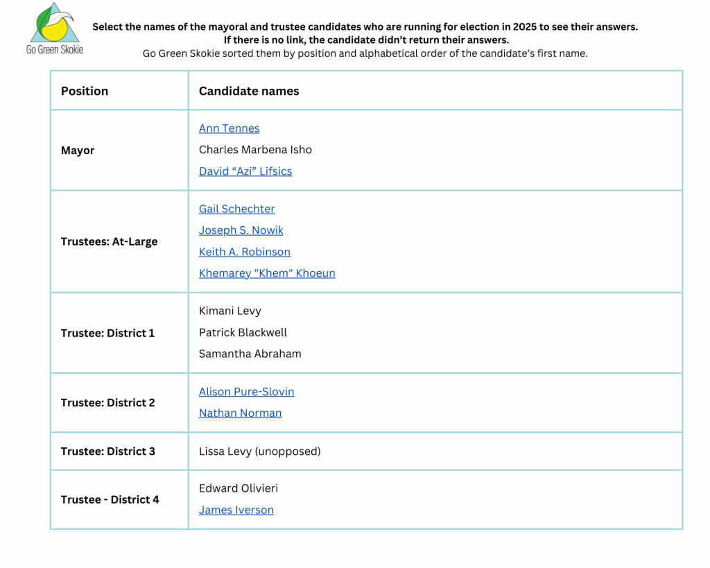 Go Green Skokie sent the following questions about climate change, Environmental Sustainability Plan, and their own priorities and vision of Skokie to all mayoral and trustee candidates who run for election in 2025.